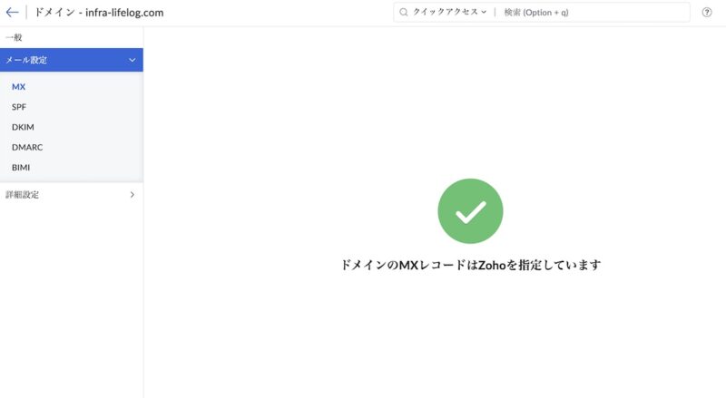 設定後、Zoho Mail管理コンソールで各レコードの認証状態を確認し、すべてが緑色のチェックマークになれば完了です。