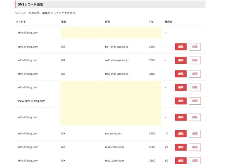 ※独自ドメインメールはZoho mailなのでMXの部分はZohoですが、メール利用しない場合はここの設定はありません)