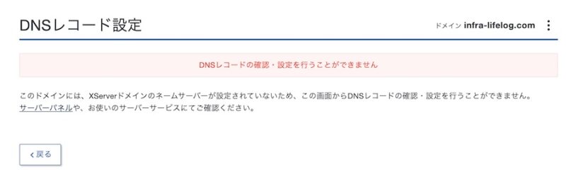 ※ネームサーバーを変更すると、独自ドメイン管理側(今回はXserverドメイン)では「DNSレコードを編集できません」と表示されるようになります。